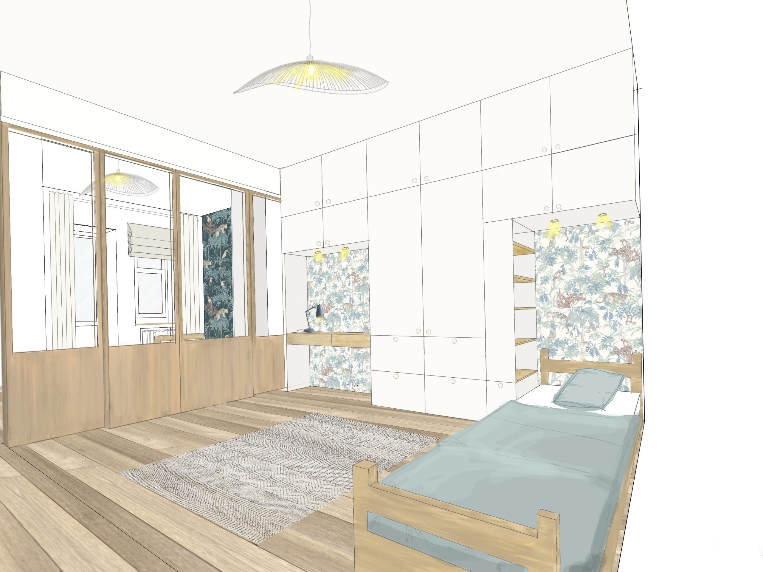 Oriane et Olivier mon contacté pour trouver une solution pour séparer la grande chambre de leur enfant en deux. Je leur ai proposé deux possibilités, une cloisons coulissant pour bénéficier d’une grande chambre quand les enfants le souhaitent. Ou bien de deux chambres distinctes l’une de l’autre par une verrière fixe. Ils sont décidés de choisir la cloison coulissante.